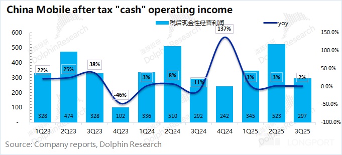 隨著 5G 高投入期的收尾,中國移動的資本開支已經明顯回落。由於當前公司資本開支逐步回落,而攤銷折舊仍然較高,那麼公司的現金性經營利潤將比財報中的經營利潤(稅後約為 256 億元)更高,公司實際上也是更加賺錢的。海豚君測算公司本季度稅後現金性經營利潤為 297 億元,同比增長 2%。