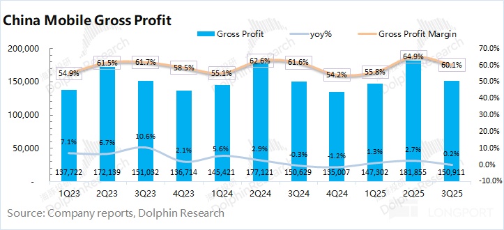 中國移動 2025 年第三季度毛利率 60.1%,同比下降 1.5pct。海豚君將 「網絡運營及支撐成本」 和 「銷售産品成本」 列為營業成本,進而測算公司毛利及毛利率情況。