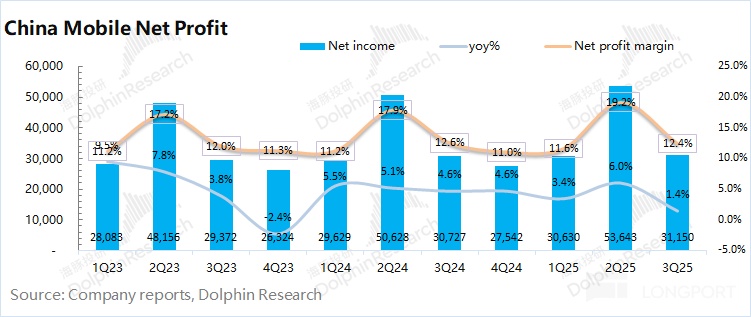 中國移動 2025 年第三季度淨利潤 312 億元,同比增長 1.4%。公司本季度經營費用率的減少,抵消了毛利率下降的影響,最終帶動了利潤端的增長。