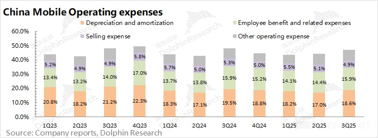 中國移動 2025 年第三季度經營費用 1181 億元,同比增長 0.5%,保持平穩。海豚君將 「銷售費用」、「僱員薪酬費用」、「折舊及攤銷」 和 「其他營運支出」 四項都放在經營費用中;