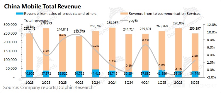 中國移動 2025 年第三季度總營收 2509 億元,同比增長 2.5%。分項來看,其中公司本季度來自於通訊服務的收入為 2162 億元,同比微增 0.8%;來自産品銷售及其他的收入為 347 億元,同比增長 14.8%,是公司本季度增長的主要推動力。
