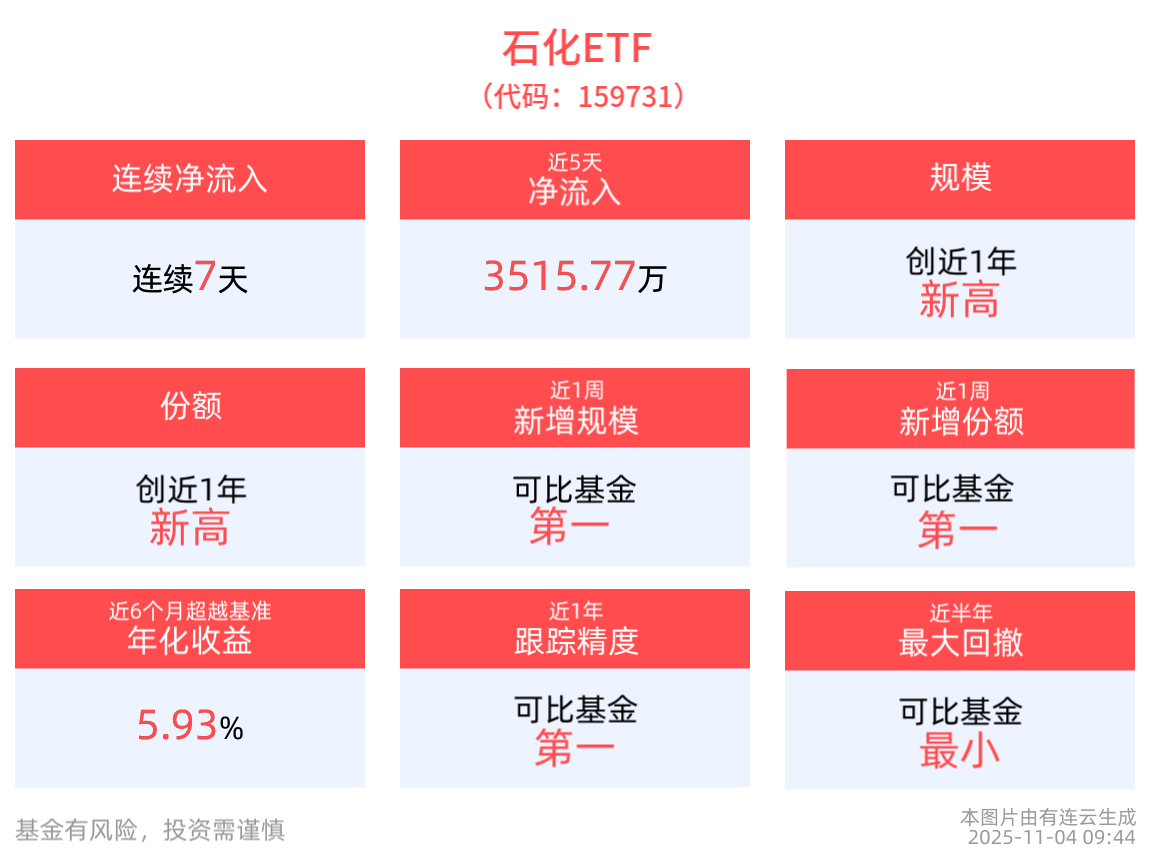 跟踪精度方面,截至2025年11月3日,石化ETF近1年跟踪误差为0.037%,在可比基金中跟踪精度最高。