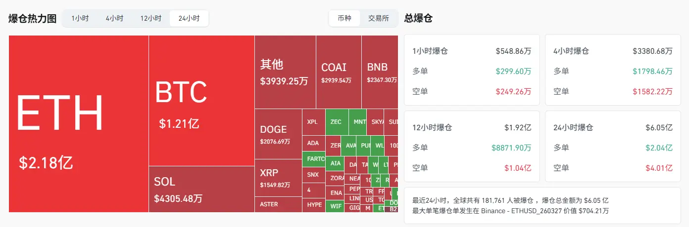 - 24小時爆倉數據:全球共181455人被爆倉 ,爆倉總金額為6.05億美元,其BTC爆倉1.21億美元、ETH爆倉2.18億美元、SOL爆倉4354萬美元