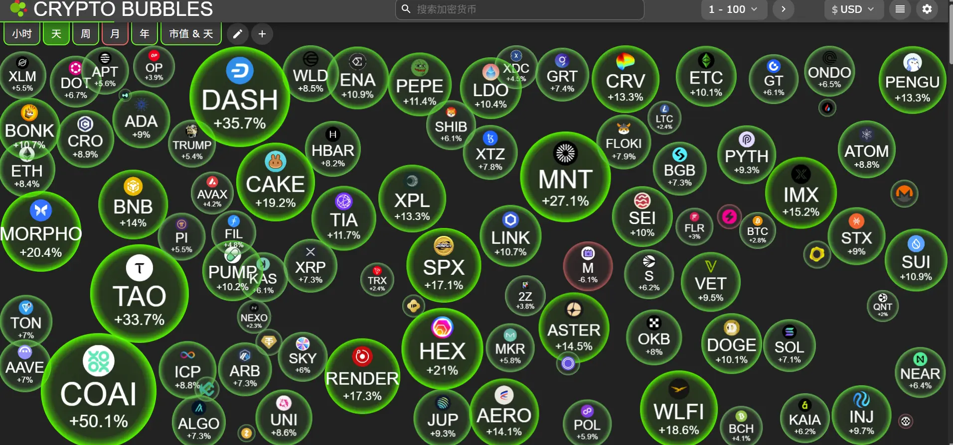 今日市值前100幣種最大漲幅:COAI漲53.8%、DASH漲35.7%、TAO漲33.7%、MNT漲27.1%、HEX漲21%。