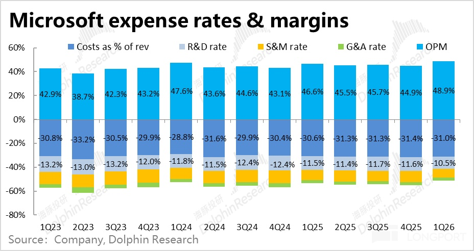 本季微軟的毛利率為69%,雖然確實同比下降了0.4pct,但比彭博預期高出了整整1.5pct。同時,經營三費合計同比增長僅4.9%,相比上季的5.8%繼續收窄,也遠低於營收和毛利潤約18%的增速,從而費用率佔收入比重同比來看被攤薄了整整2pct。