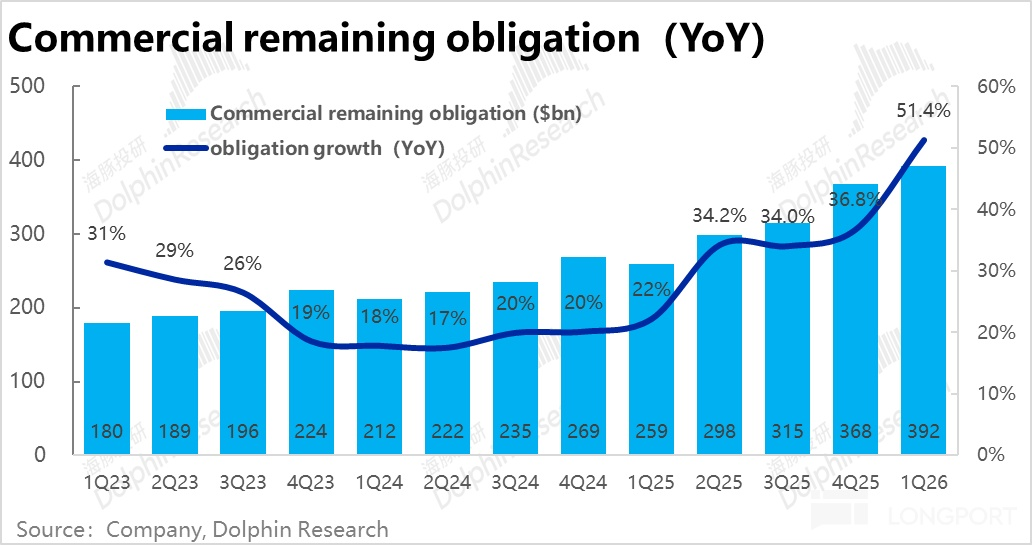 因此,待履約企業合同餘額本季增速也拉高到了51%,達$3920億,環比上季增多了240億。平均合約年限在2年左右,換言之,僅考慮目前已有的未履約企業合同,就能確保後續每年近2000億的收入。