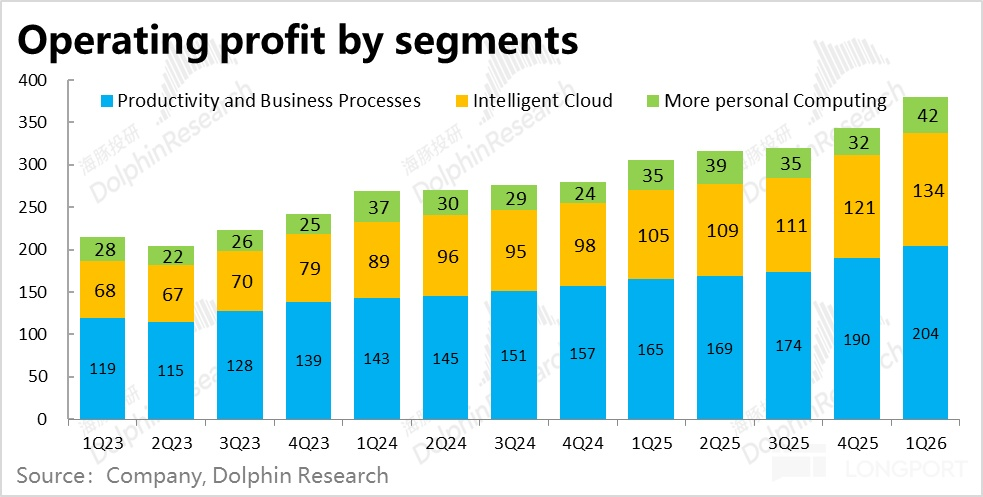 利潤表現則更出色,提效和控費對沖了折舊導致的毛利率下滑,本季度微軟整體經營利潤率整整同比走高了2.3pct。最終經營利潤$380億,同比增長了24%,大幅跑贏營收增速。
