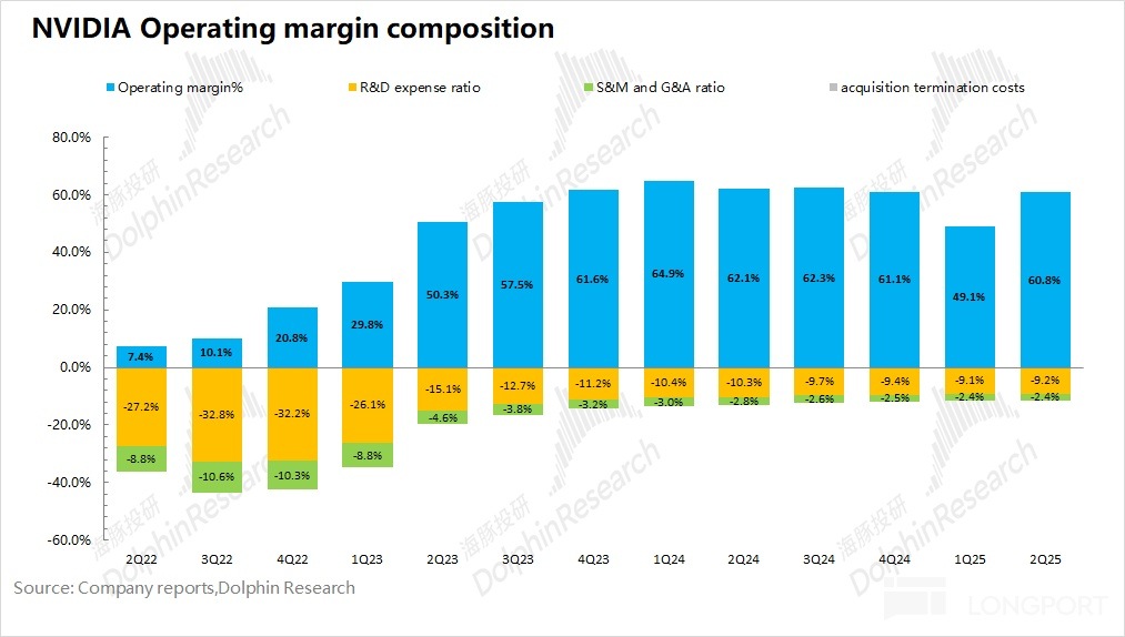 2026 财年第二季度英伟达核心经营利润率为 60.8%,明显回升。公司上季度受 H20 存货减计的计提费用,导致了毛利率的 “闪崩”。