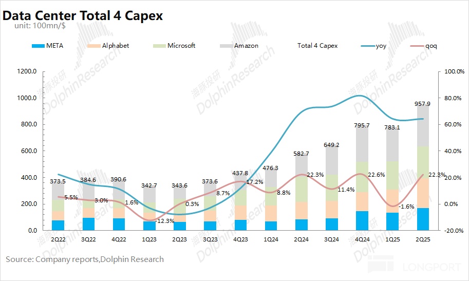 而通过四家公司的管理层交流,海豚君预期四大厂商在 2025 年的资本开支有望达到将近 4000 亿美元,同比增长 58%,这也为公司下半年业绩的持续增长带来保障。