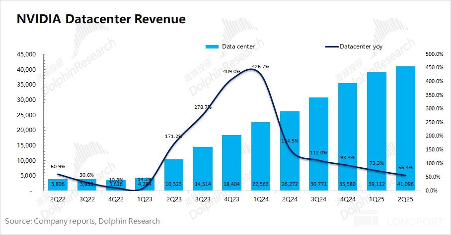 对于英伟达数据中心业务的核心驱动点仍然是云服务厂商对 AI 服务器的需求。2025 年第二季度四大核心云厂商的合计资本开支达到 958 亿美元,同比增长 64.4%。结合公司数据中心业务 70% 的同比增速来看(不考虑 H20 影响的情况下),英伟达在巨头资本开支中的份额仍在提升。