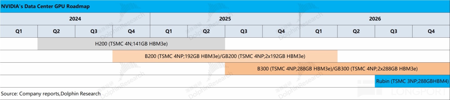 b)Rubin 产品进展:公司在 3 月就公布了后续的产品路线图,随着 GB300 进入量产,市场将一部分的注意力移到 Rubin 产品上。公司此前披露 Vera Rubin NVL144 将在 2026 年下半年上市,其性能将是 GB300 NVL 72 的 3.3 倍,这也展现出英伟达的产品迭代能力。