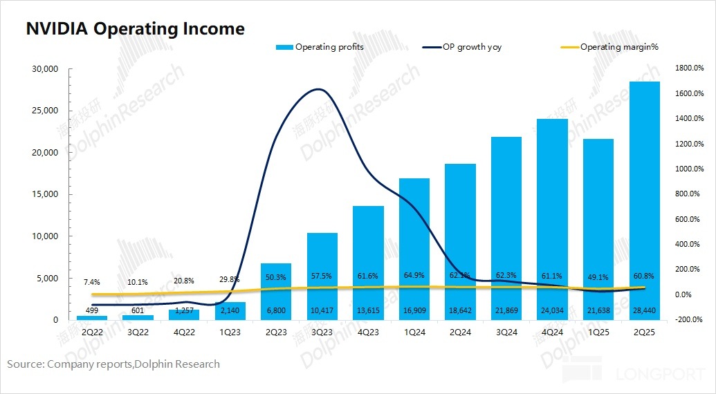 由于净利润还受到非经营性项目的影响,海豚君相对更关注于公司的核心经营利润(毛利- 研发费用- 销售、行政等费用)。公司本季度核心经营利润 284 亿美元,同比增长 52.6%。核心经营利润率回升至 60.8%。上季度利润端的下滑,主要是受 H20 存货减值的影响。随着毛利率的回升,公司核心经营利润率依然稳定在 60% 上方。