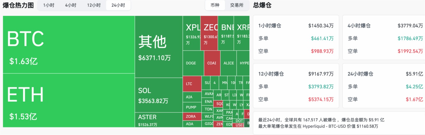 24小时爆仓数据:全球共167517人被爆仓 ,爆仓总金额为5.91亿美元,其BTC爆仓1.63亿美元、ETH爆仓1.53亿美元、SOL爆仓3563.82万美元