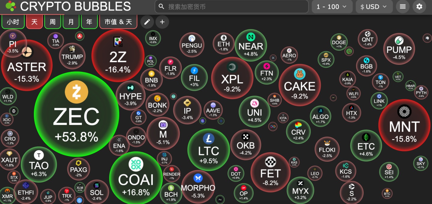 今日市值前100币种最大涨幅:Zcash涨53.8%、ChainOpera AI涨16.8%、Litecoin涨9.5%、Bittensor涨6.3%、NEAR Protocol涨4.8%。