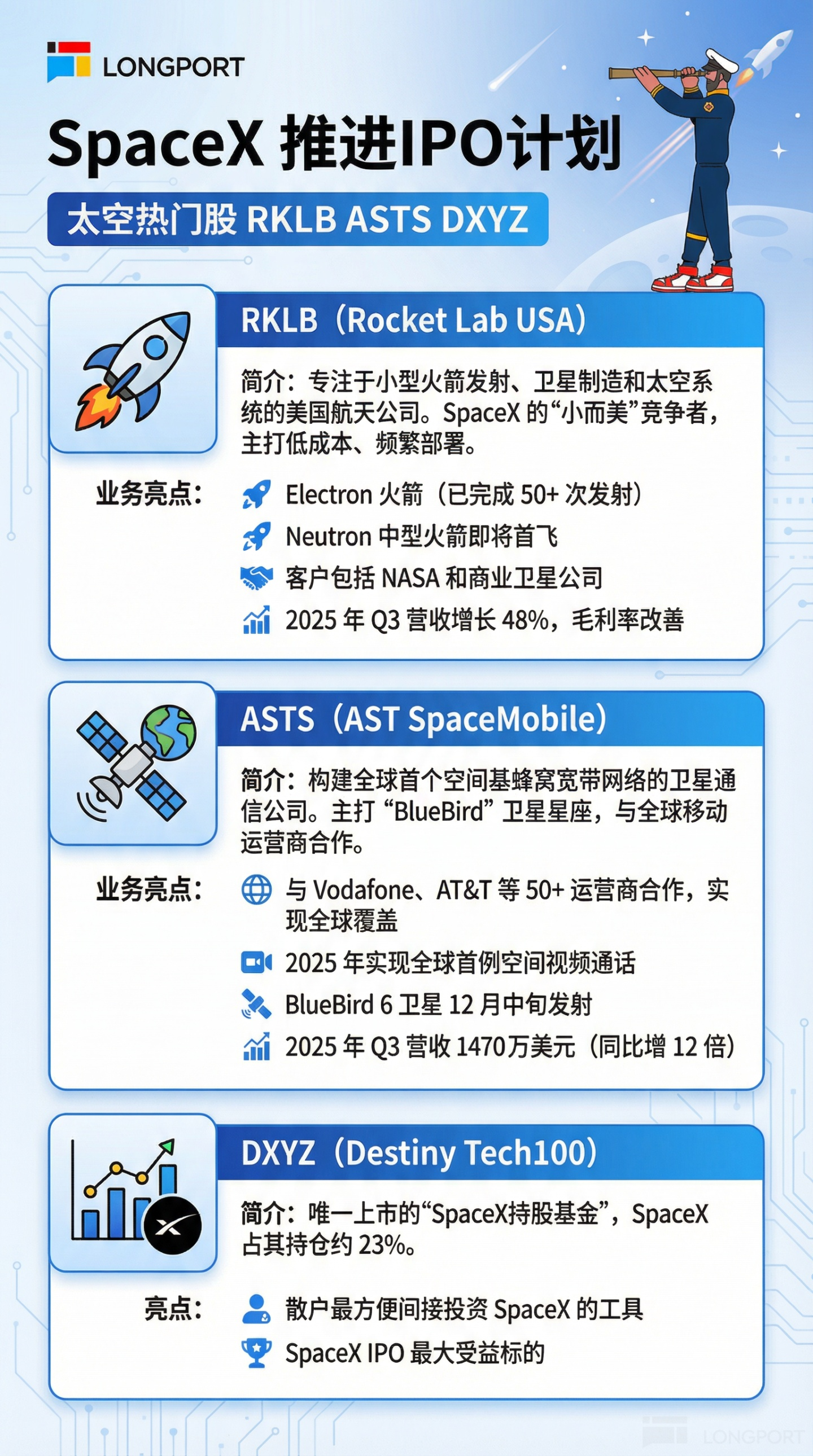 据 Bloomberg 12 月 9 日报道,SpaceX 正推进 2026 年中后期整体 IPO 计划,目标融资显著超过 300 亿美元,公司估值约 1.5 万亿美元,这将创下历史最大规模上市纪录。同时,马斯克在 X 上直言有意进军轨道数据中心,称太空数据中心是 “未来 4 年内扩充算力的最快方式”。太空经济加速爆发,作为 SpaceX 概念股的核心代表,$Rocket Lab(RKLB.US) 、$AST SpaceMobile(ASTS.US) 年内涨幅分别达 109.8%、245.2%,持续受益板块热度。