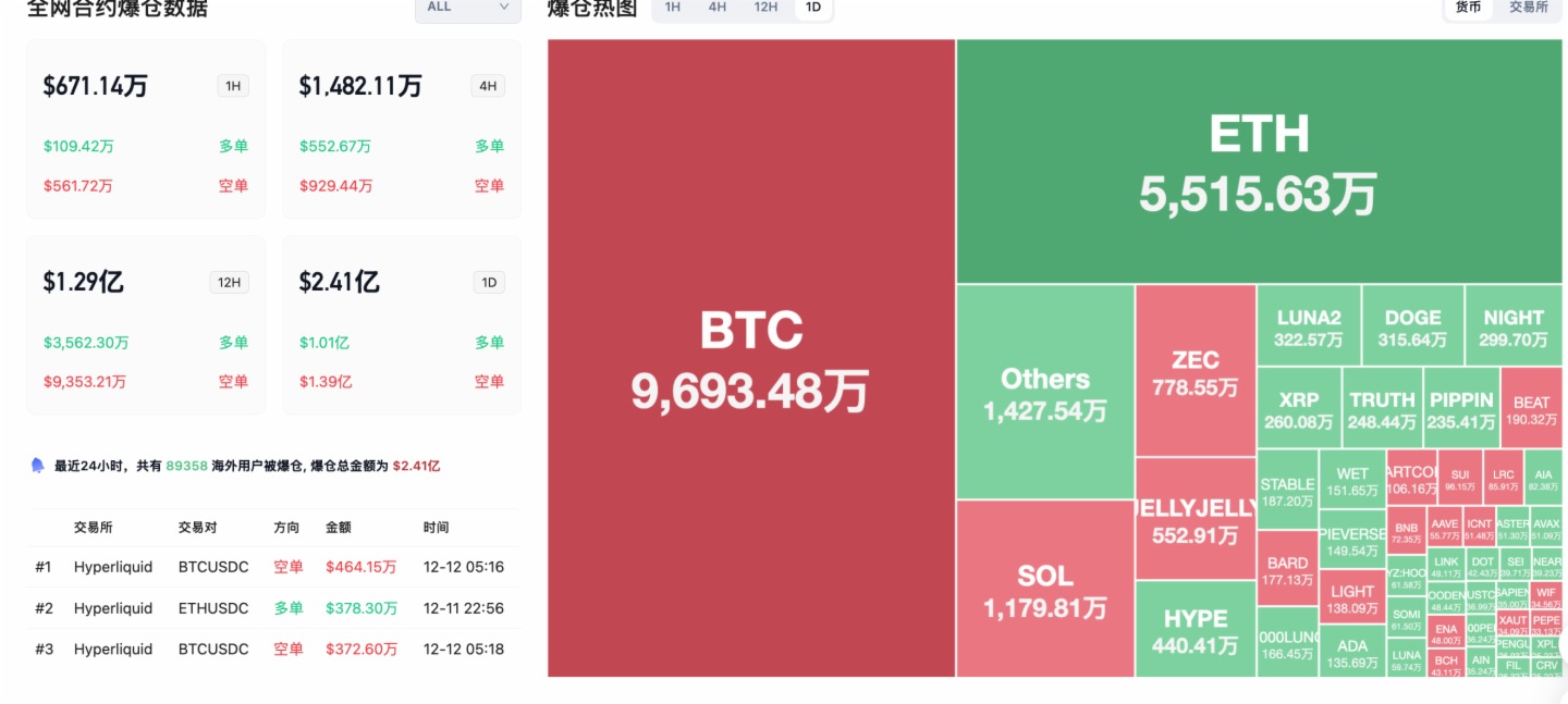 24小時爆倉數據:全球共89358人被爆倉 ,爆倉總金額為2.41億美元,其BTC爆倉9693萬美元、ETH爆倉5515萬美元、SOL爆倉1179萬美元