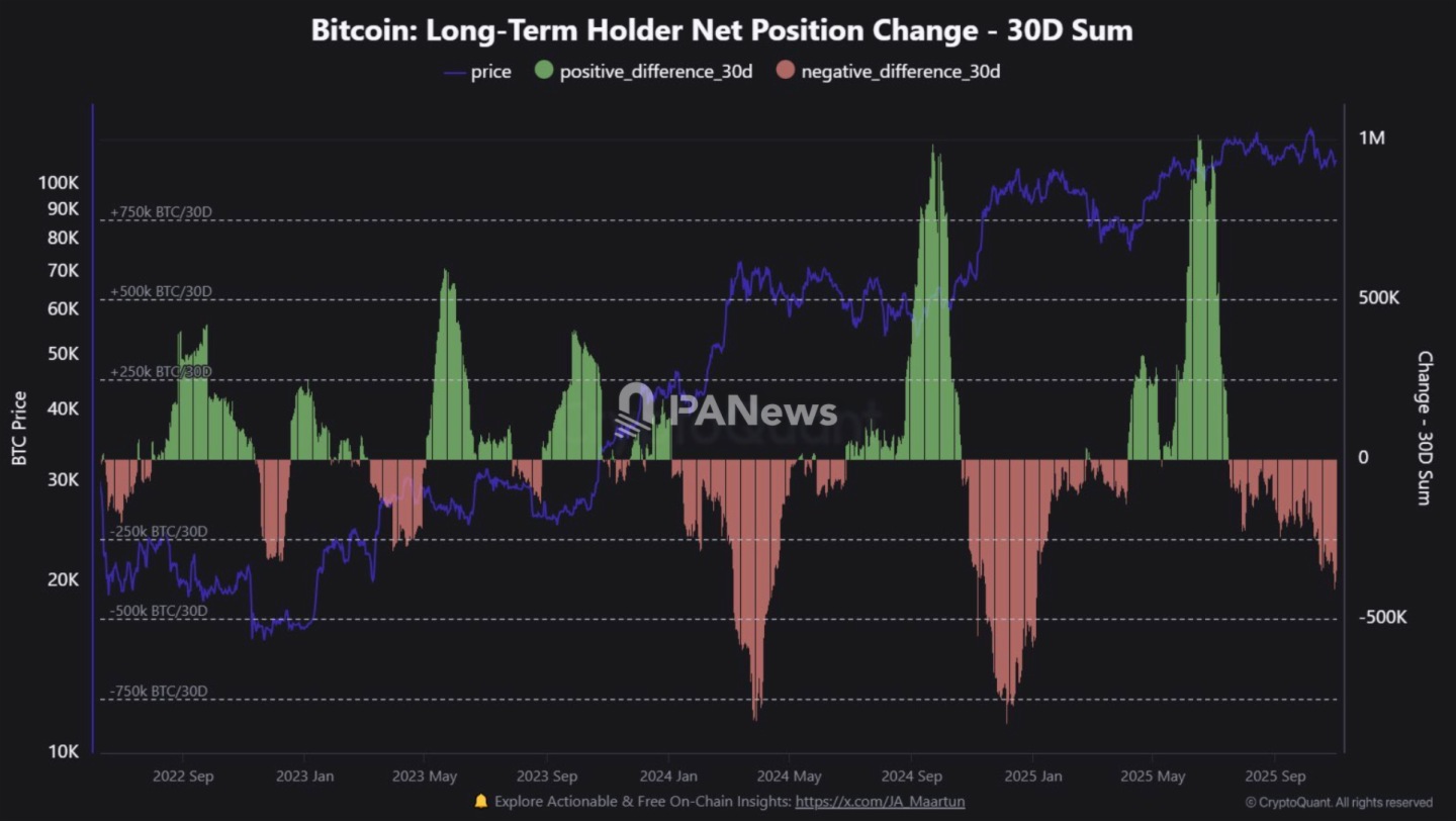 PANews 11月4日消息,加密分析師 Quinten 表示,過去30天,比特幣長期持有者共計抛售約40萬枚BTC,約佔比特幣總供應量的近2%。盡管面臨大量抛壓,比特幣仍維持在10萬美元以上。他指出,一旦真正的市場需求啓動,比特幣價格或將迎來更大上行空間。