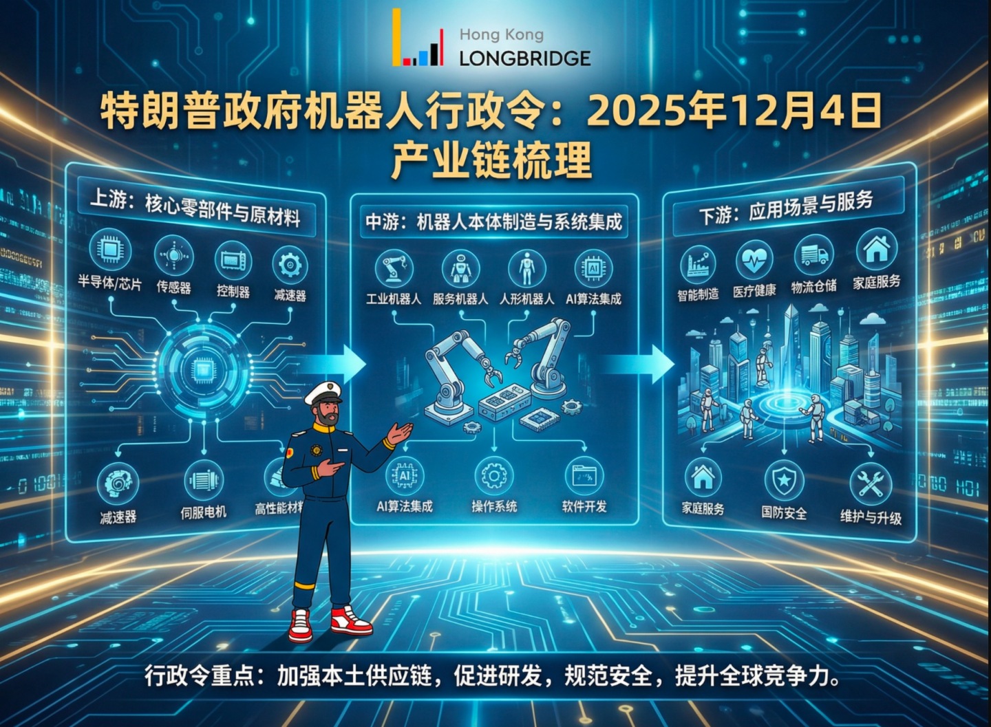 - 政策要點: 建立國家機器人戰略和發展路綫圖,增加聯邦投資(機器人融資已在翻倍增長),並簡化監管,以加速創新和部署。