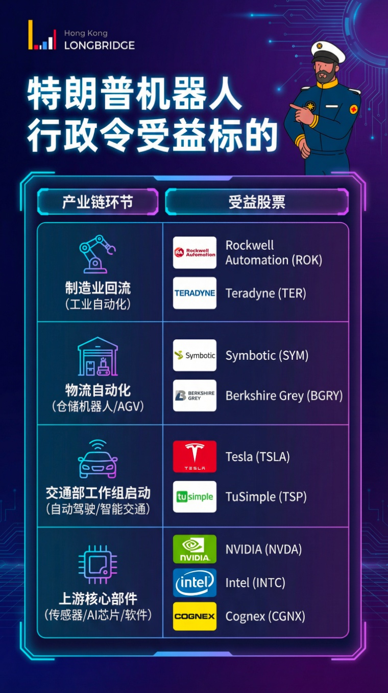 美股標的將更直接受益於美國本土制造業回流、物流自動化和交通部工作組的啓動。