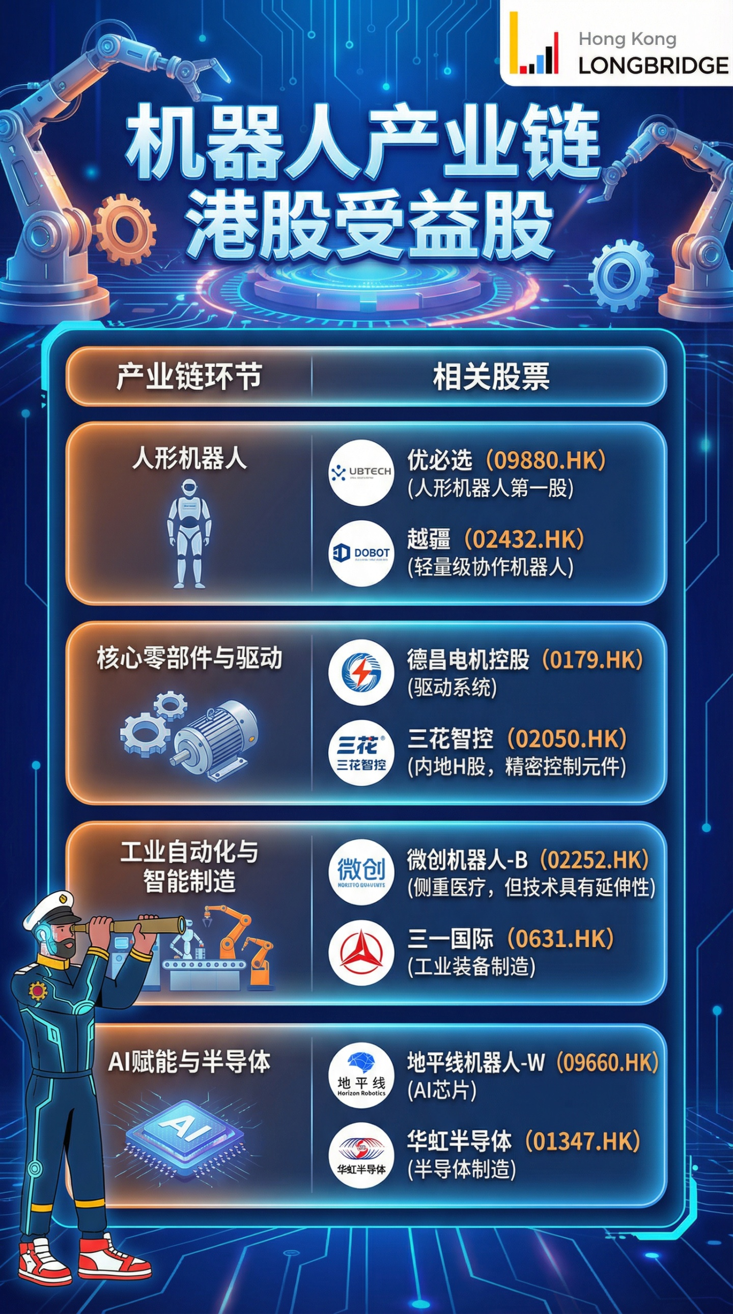 - 機器人核心零部件: 提供高精度傳感器、精密機械、以及 AI 機器人軟件平台的公司。