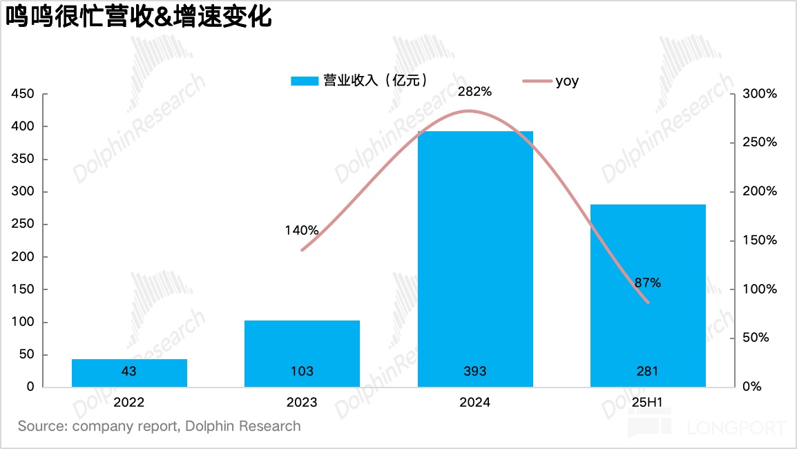 開店狂飙也帶動很忙的營收從 2022 年的 43 億元迅速提升至 2024 年的 393 億元,CAGR 達到 202%。(其中 2024 年高速增長和零食很忙和趙一鳴零食在 2023 年底並表有關)