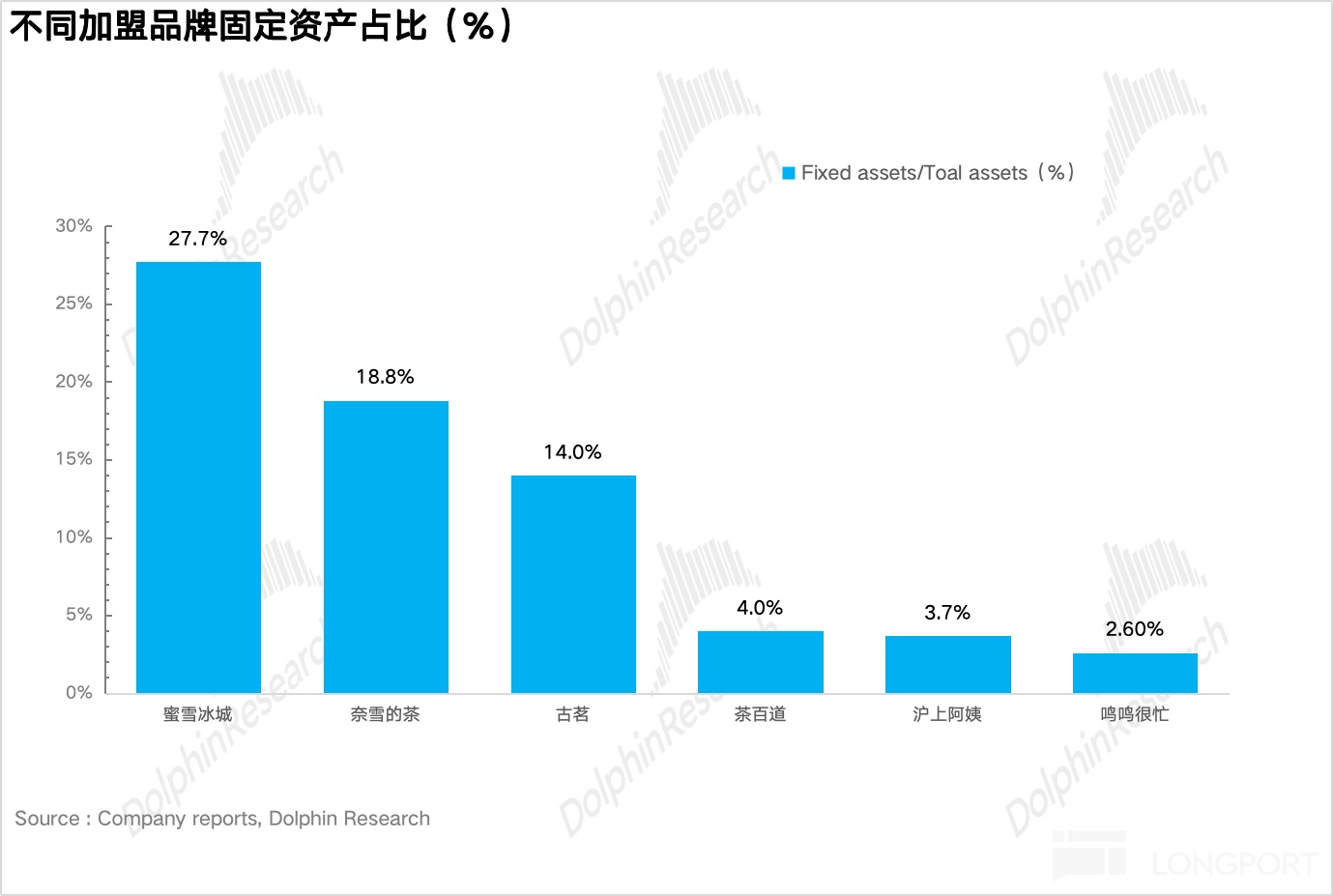 由於公司 98% 的門店均為加盟模式,加盟商承擔實際的開店&運營成本,且公司不需要像茶飲一樣自建廠房生産實際的原材料,免去了制造環節,因此固定資産投入很低,從下圖可以看到很忙的固定資産佔比僅為 2.6%,是高度輕資産運營的模式。