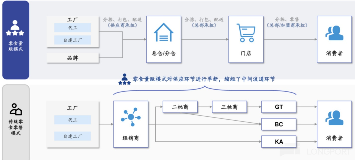 - 零食品牌專營店:高成本 + 高效率。21 世紀初,以來伊份為代表的零食品牌專營店橫空出世,第一次將零食從散裝、非標品提升到品牌化的高度。另外,相較於傳統流通環節冗長的渠道層級,零食品牌專營店砍掉了經銷商,採用短鏈經營(工廠——品牌中心倉——品牌門店),並建立了高標準的門店係統,提升了商品的新鮮度和購買體驗,對物流、倉儲等各個環節的信息流也實現了完全的自主掌控,效率大幅提升。