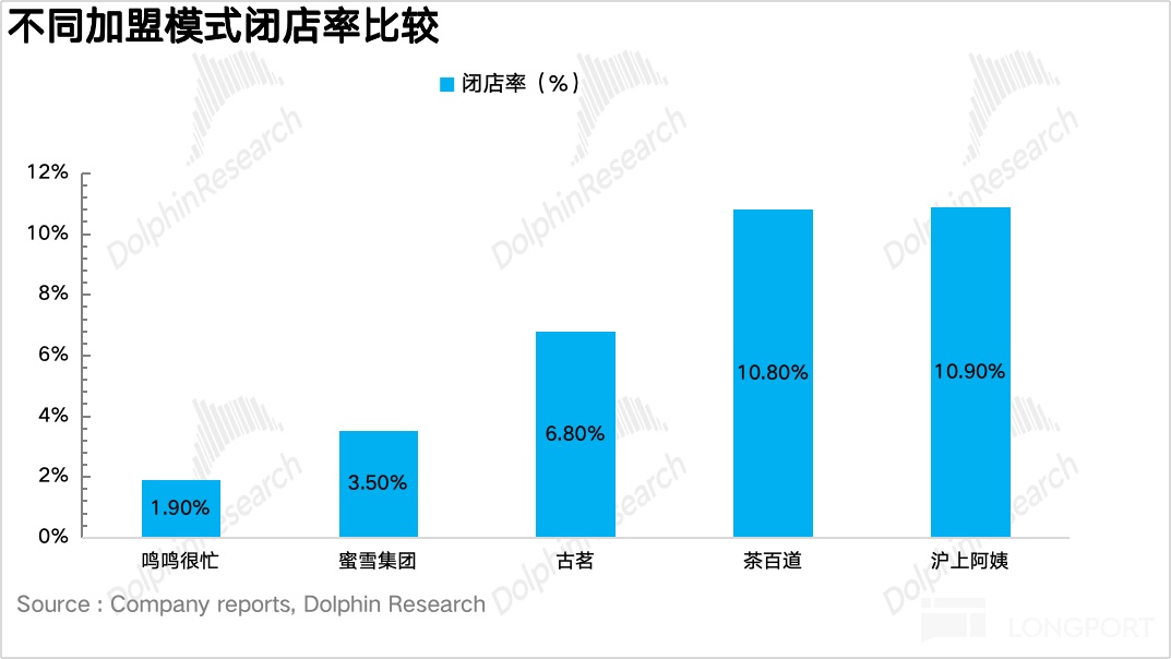 也就是說,鳴鳴很忙的收入結構高度單一,實際充當的是 「二道販子」 的角色,從上遊集中採購,並銷售給下遊的加盟門店,賺的是供貨的價差。因此,不同於依賴收加盟費為主的公司,很忙的業績取決於加盟門店的拓展和實際經營狀況,這一點可以完全類比於我們前期分析的蜜雪冰城、古茗為代表的現制茶飲的商業模式。