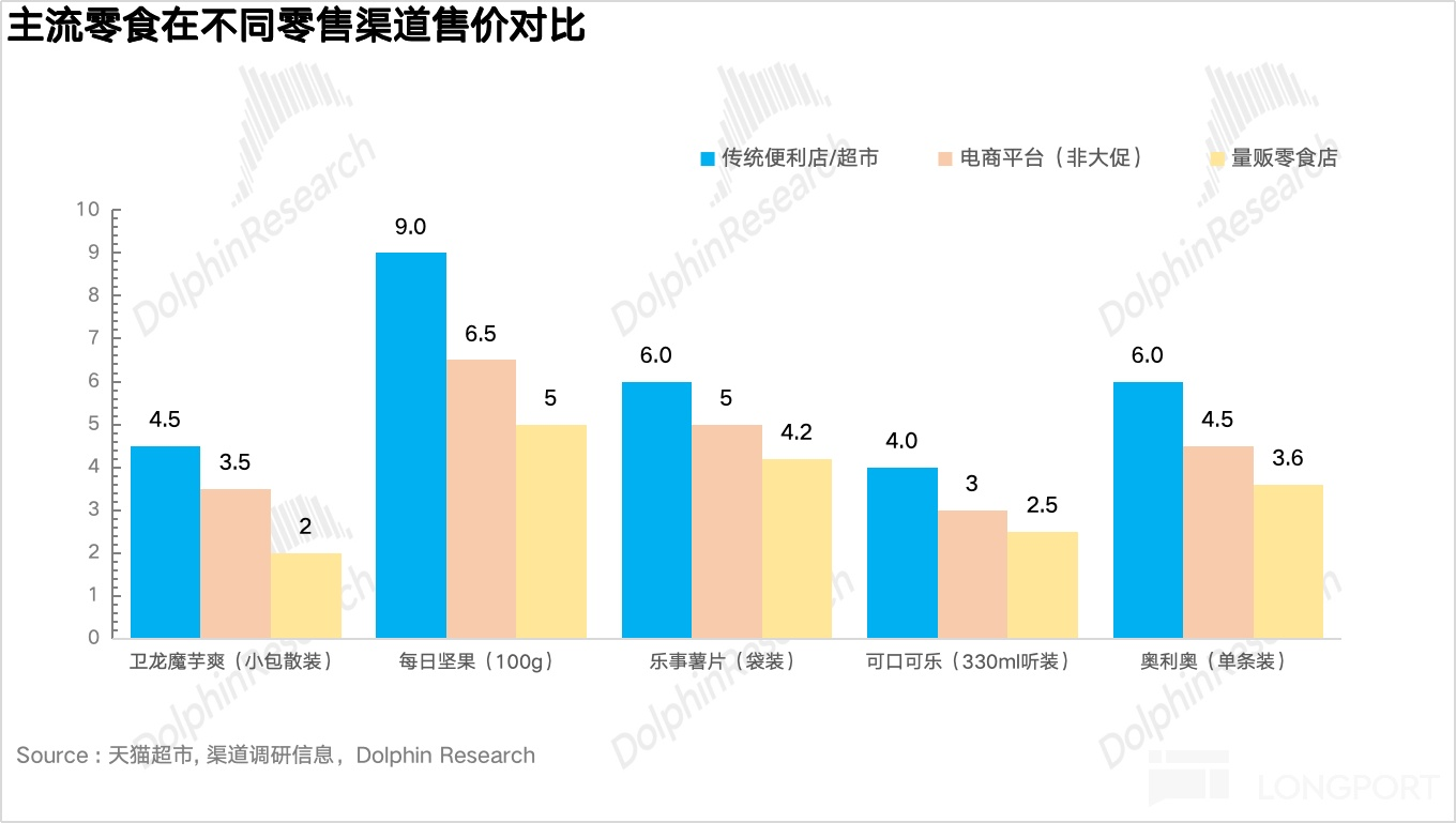 從價格上看,量販零食的全渠道加價率(出廠到終端零售價之間的價差)僅有 30%-40%,是傳統流通渠道的一半(加價率普遍在 70%-80% 以上)。從下圖可以看到,同品牌、同規格的産品在量販零食渠道的價格是市面上的最低價,比電商還要低 20%-30% 左右。