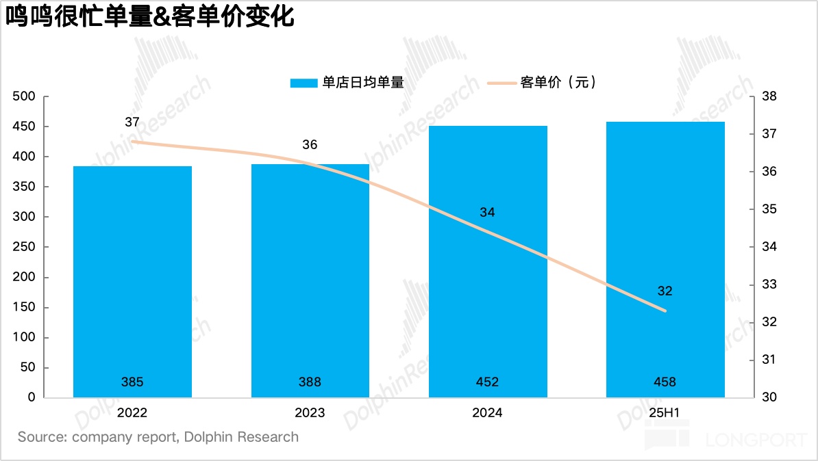 單店營收上,量價拆分來看,可以看到最亮眼的地方在於伴隨近年來的高速拓店和加密,很忙的單店日均單量不僅沒有被稀釋,反而逆勢從 385 單/天提升近 20% 達到到 458 單/天,證明了很忙自身的硬折扣價格優勢成功奪取了其他休閑零食渠道的流量,完成了自身市場份額的提升,這也是海豚君認為非常難能可貴的點。