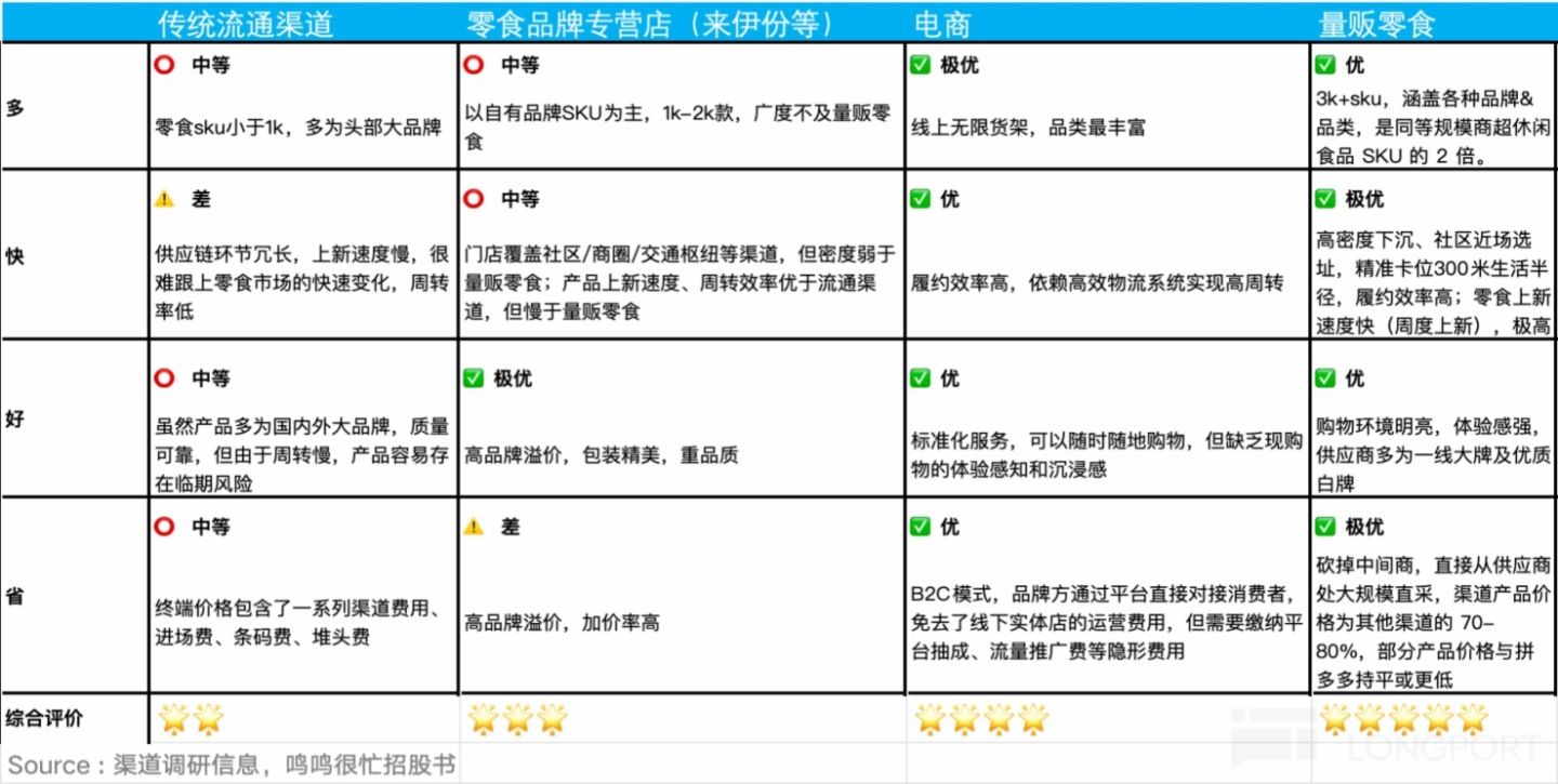 在量販零食店出現以前,國内消費者購買休閑零食的主流渠道無外乎綫下的傳統商超、夫妻老婆店等為代表的流通渠道、零食品牌專營店(良品鋪子、來伊份)以及綫上的電商渠道。為了讓各位投資者了解很忙深耕的量販零食和其他零售渠道的區別,海豚君在下表從零售業態的經典框架 「多快好省」 對各渠道進行了詳細梳理: