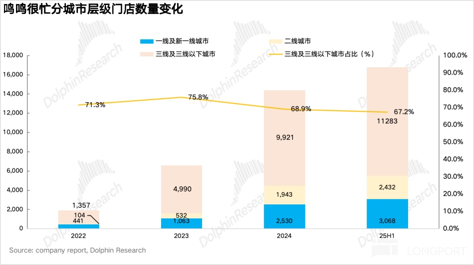 而從門店分佈上看,從下圖可以看到很忙三綫及以下門店佔比接近 70%(58% 的門店位於縣城和鄉鎮),是極度下沉的零售業態。近年來隨著新增門店的選址重心向一二綫城市傾斜,很忙下沉市場佔比逐步下滑,和古茗類似,採用的是 「農村包圍城市」 的擴張打法。