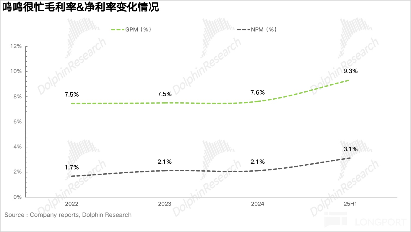 根據招股書,從下圖可以看到過去三年很忙的毛利率穩定在 7%-8% 之間,處於極低的水平。(25 年上半年,很忙和趙一鳴零食内部整合結束,議價能力強化帶動整體毛利率有所提升)