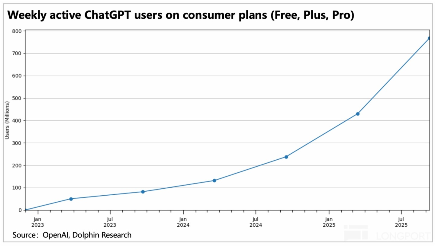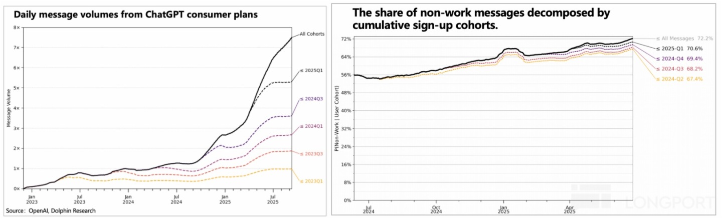 当然,OpenAI 能够产生影响的关键,在于其目前巨量的用户规模和交互粘性。目前周均 7 亿的用户,每日交互量数倍增长,其中非工作相关的交互量从去年 7 月的 56% 上升到 72%。越晚注册(1Q25)的用户,交互频率越高,且越与工作无关。这里体现到 ChatGPT 的破圈效应,已经从工作流的核心用户,拓展到普通用户圈层。