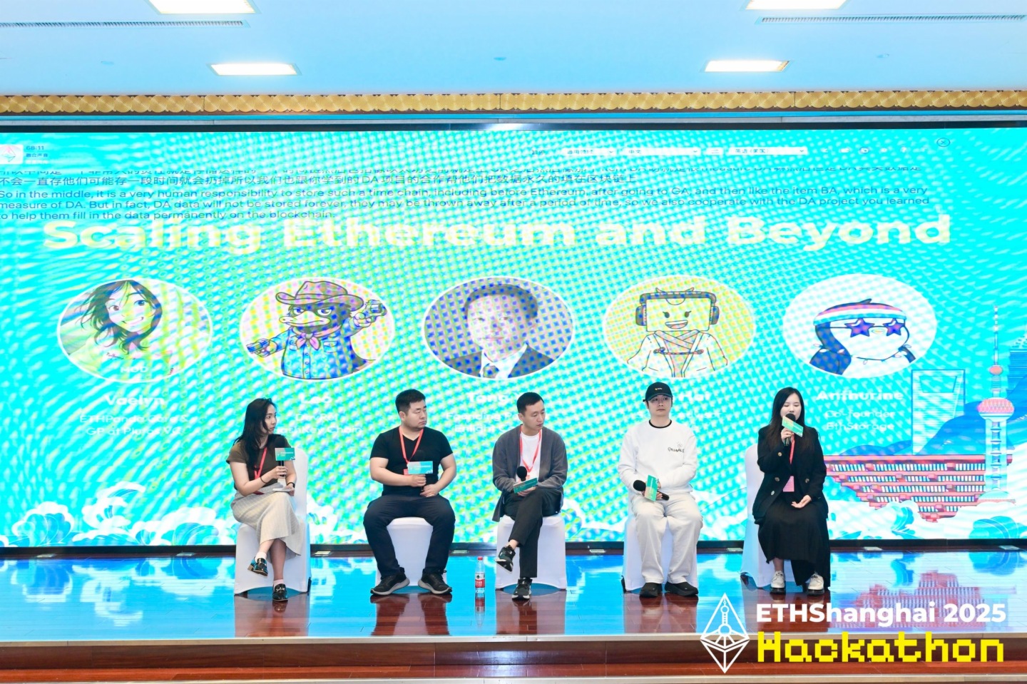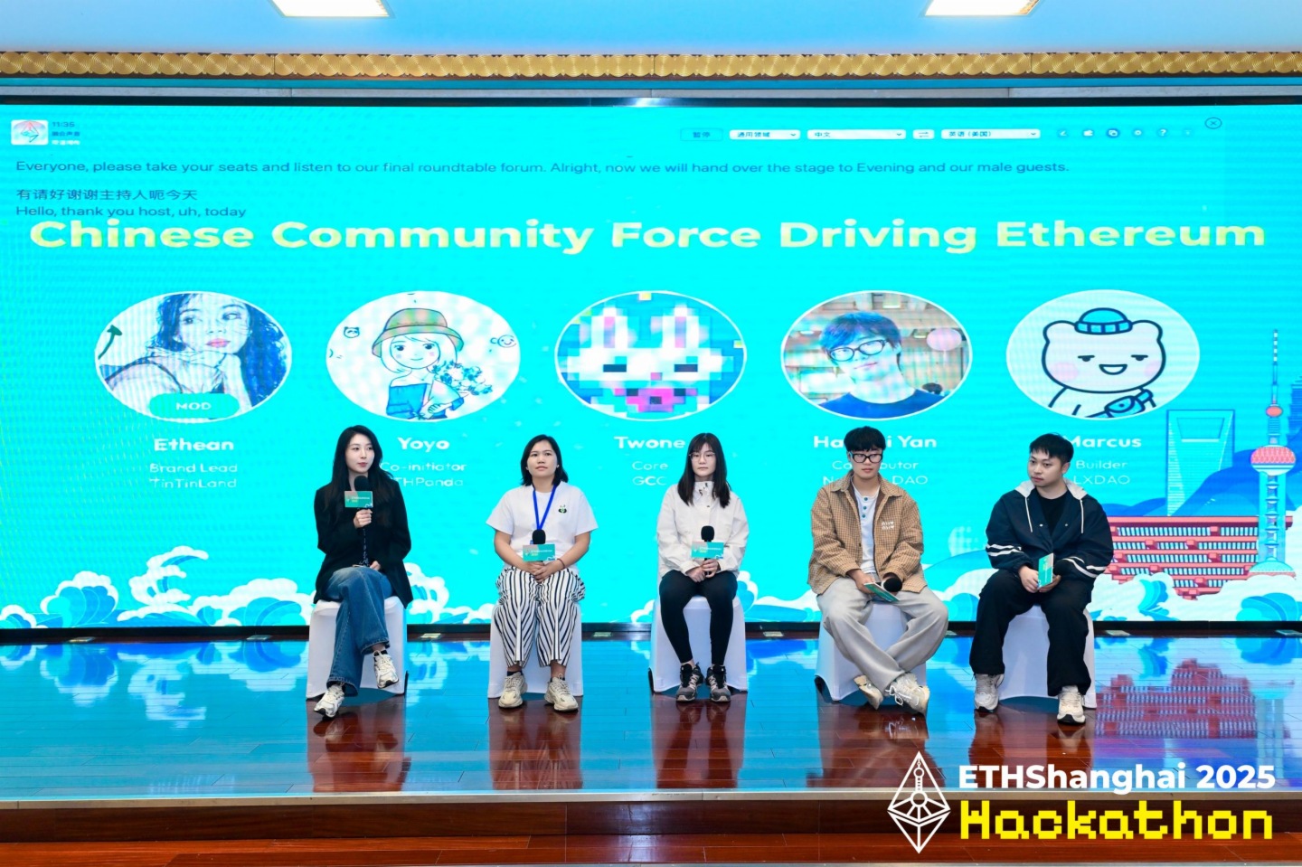 最后,在“推动以太坊发展的中文社区力量”圆桌讨论中,来自各大以太坊开源社区的代表——TinTinLand品牌负责人Ethean、ETHPanda联合发起人Yoyo、GCC核心成员Twone、Nantang DAO贡献者 Hanbai Yan以及LXDAO贡献者Marcus纷纷分享了各自创立社区的初衷以及对以太坊理念的认可,并介绍了他们对以太坊技术和资金方面的支持,尤其强调了扩大华语社区在全球市场的影响力的重要性。