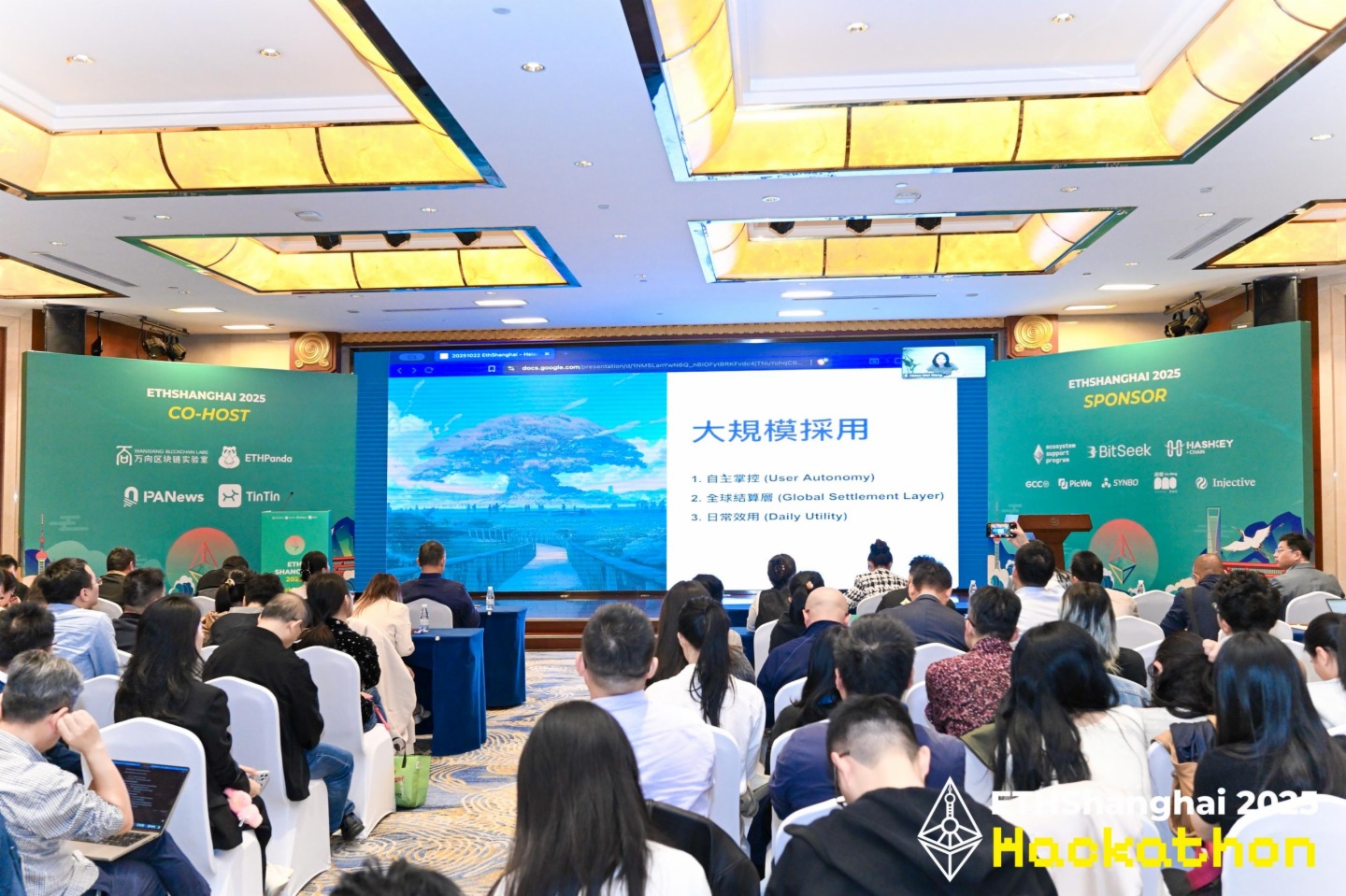 10月22日,ETHShanghai 2025主峰会在上海圆满落幕。本届大会以“拓展以太坊,塑造开放未来”为主题,由华语建设者社区ETHPanda联合万向区块链实验室、PANews与TinTinLand共同主办。大会吸引了来自全球的40余位行业领袖,围绕以太坊扩容、模块化生态、开发者增长及长期安全等核心话题进行了精彩分享与深度讨论,并在大会上正式公布了ETHShanghai 2025黑客松的获奖者。