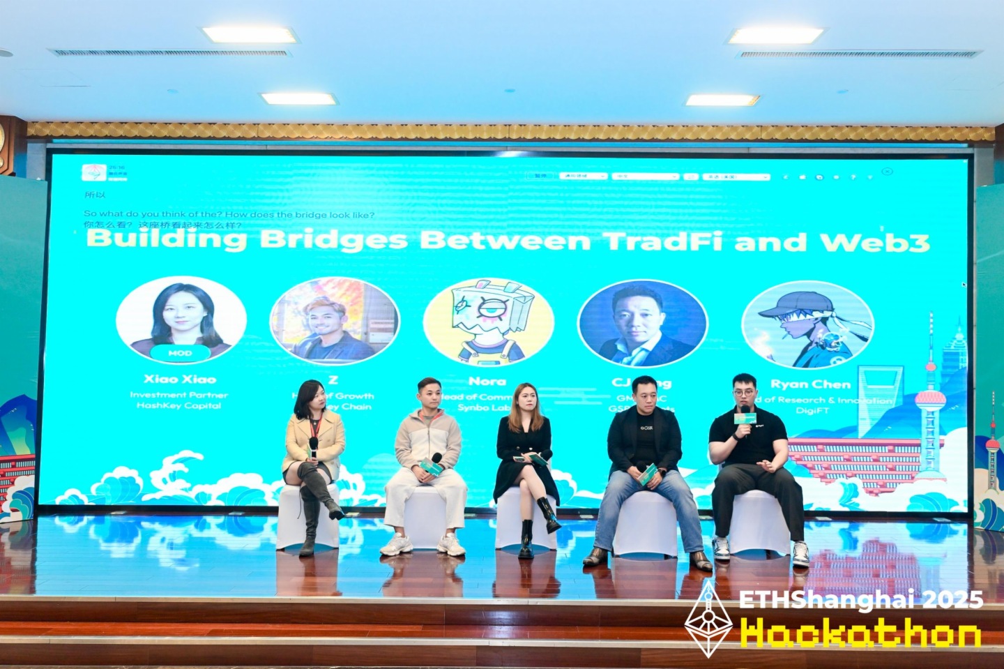 在“从TradFi到Web3:搭建信任与价值的桥梁”圆桌讨论中,汇聚了HashKey Capital投资合伙人Xiao Xiao、HashKey Capital业务增长人Z、Synbo Labs社区负责人Nora、GSR Markets亚太区总经理CJ Fong和DigiFT研究与创新负责人Ryan Chen。
