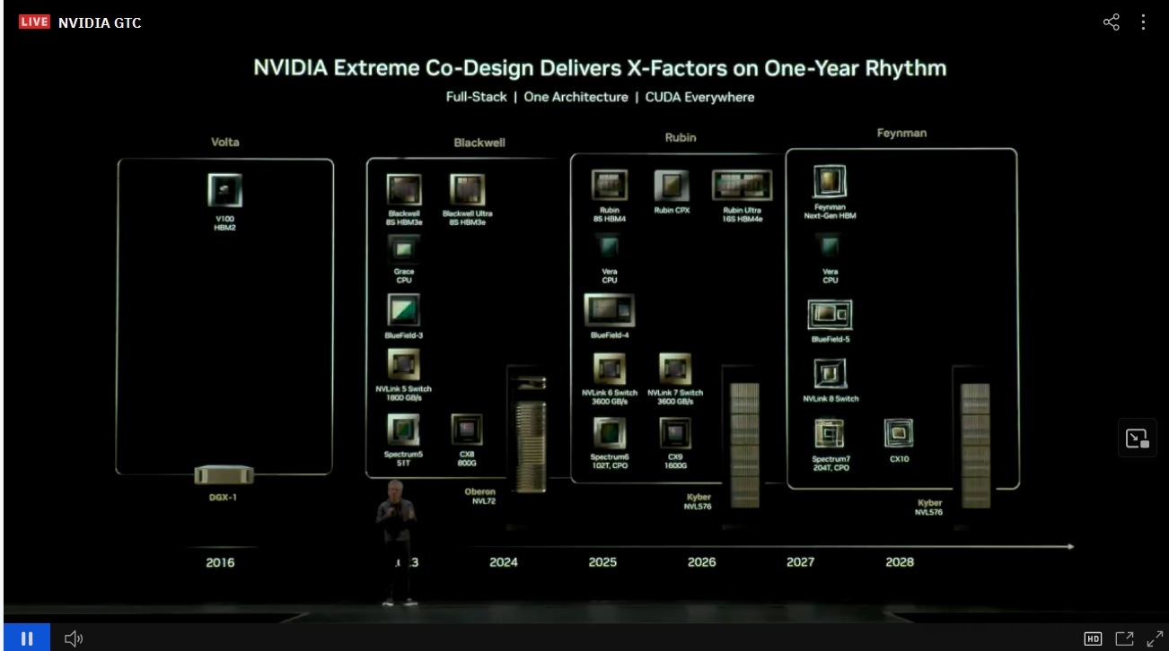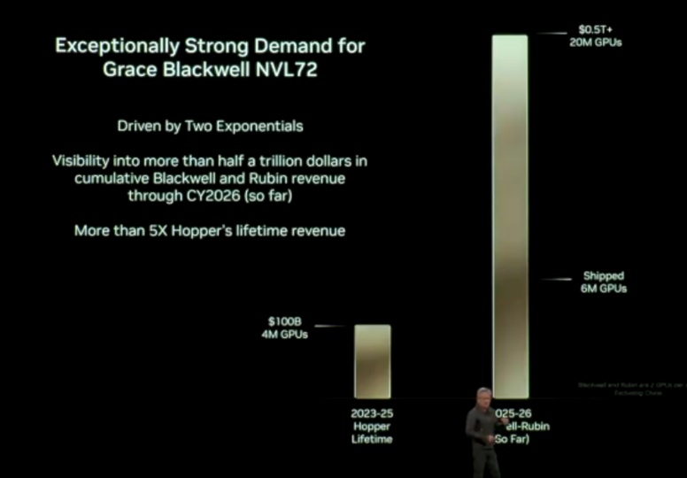 公司在本次 GTC 大会上直接给出了 “Blackwell+Rubin” 至 2026 年底将合计出货 2000 万颗,带来 5000 亿美元的收入。截止目前 Blackwell 已经出货了 600 万颗,从而推测未来 5 个季度将合计出货 1400 万颗,带来将近 3500 亿美元的收入。