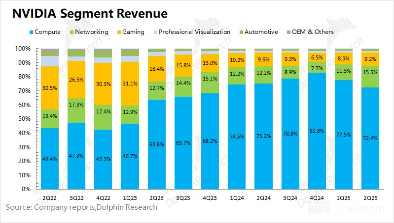 从英伟达的业务情况看,数据中心业务已经成为公司最大的收入来源,占比接近 90%。数据中心业务中又可以细分为计算收入和网络收入两部分,上述 3500 亿美元的数据中心 GPU 收入属于计算收入范畴,通过计算收入与网络收入间的比例关系,可以推测公司未来 5 个季度的数据中心收入将达到 4200 亿美元以上。